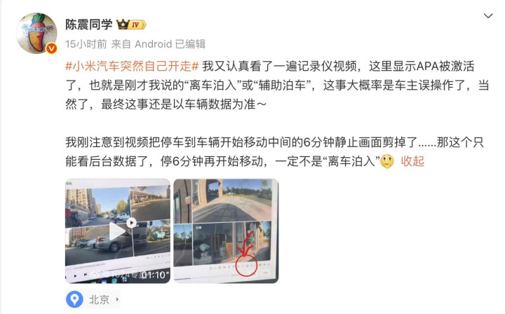 国内著名汽车媒体人陈震老师也就此事发表了自己的看法,一开始的时候,通过行车记录仪,认为大概率是车主或者授权的手机误触了“离车泊入”或者“辅助泊车”,再次查看行车记录仪时间线,发现不是“离车泊入”。